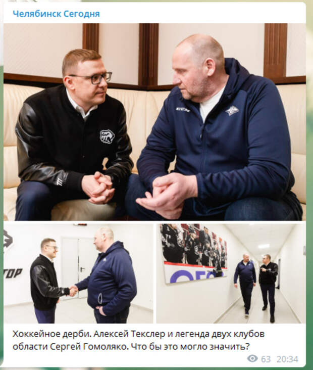«Хоккейное дерби. Алексей Текслер и легенда двух клубов области Сергей Гомоляко. Что бы это могло значить?», — такое сообщение появилось в telegram-канале «Челябинск Сегодня», где выложено фото Текслера и Гомоляко. «Губернатор пригласит знаменитого хоккеиста в свою тройку. Гомоляко прекрасно знаком челябинским любителям спорта региона. Объявить о нем могут, когда появится ясность с третьим номером списка. Предполагается, что на этой позиции будет женщина, представитель гуманитарной профессии», — пояснил URA.RU собеседник. Возглавляющий предвыборный штаб «ЕР» вице-губернатор, первый замсекретаря регионального отделения партии Анатолий Векшин был недоступен для комментариев. Сергей Гомоляко не ответил на звонок журналиста агентства.