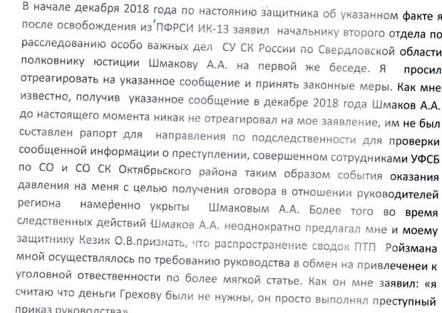 «Шмаков до настоящего момента никак не отреагировал на мое заявление, им не был составлен рапорт для направления по последственности… таким образом события оказания давления на меня… намеренно укрыты Шмаковым, — говорится в жалобе. — Более того, во время следственных действий Шмаков А.А. неоднократно предлагал мне признать, что распространение сводок ПТП Ройзмана мной осуществлялось по требованию руководства. Как он мне заявил: „Я считаю, что деньги Грехову были не нужны, он просто выполнял преступный приказ руководства“».