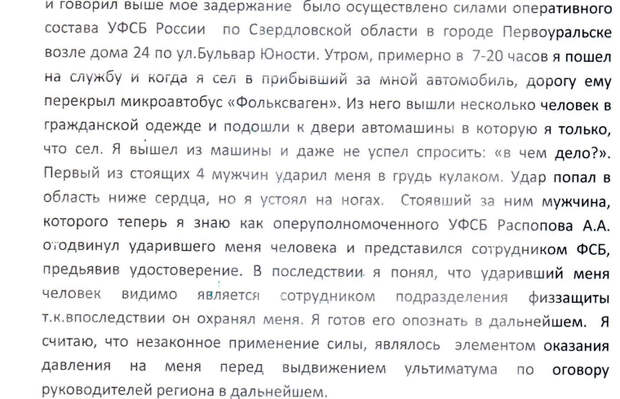 После этого дома и в рабочем кабинете Грехова в полиции прошли обыски. Затем все собрались на парковке, чтобы ехать в Екатеринбург. «К нам подошел сотрудник УФСБ Распопов А.А. и заявил, что «Грехова они забирают, так как надо с ним поработать. Распопов А.А. потребовал, чтобы я дал показания на губернатора Свердловской области Куйвашева Е.В., начальника ГУ МВД России по Свердловской области Бородина М.А., — пишет Грехов. — Он сказал мне: «Рассказывай, как таскал сводки ПТП Ройзмана губернатору вместе с Бородиным»».