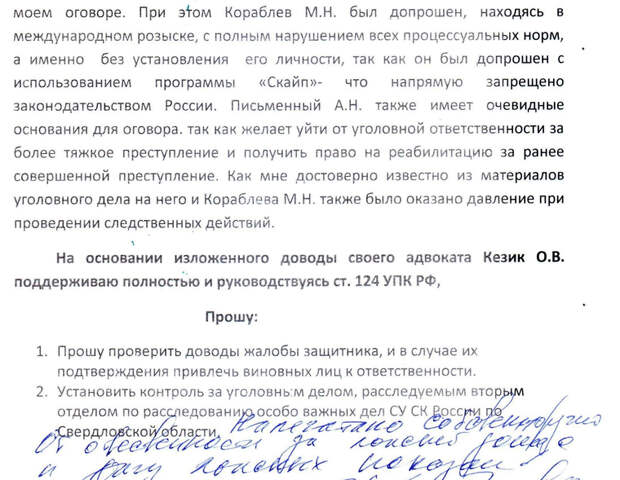 «Все произошедшее стало для меня полной неожиданностью, так как я не общался с Кораблевым, — говорится в жалобе. — В 2016 мой бывший заместитель … был осужден за совершение данного преступления, так как действительно передал такую информацию Кораблеву. Данный приговор вступил в силу после обжалования его в Верховном суде».