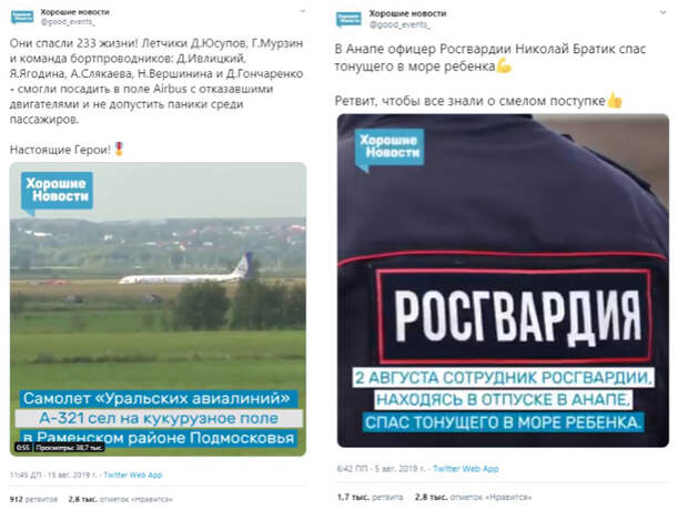 Twitter без объяснения причин приостановил действие учетной записи нашего проекта», — сообщила администрация «Хороших новостей». По их словам, к блокировке могла привести публикация о том, что промышленность России превысила показатели других стран, в том числе США.«Хорошие новости» — проект, освещающий достижения России в области экономки, науки, культуры, спорта и социальной сфере. В октябре количество просмотров публикаций составило 6,18 млн. Среди подписчиков аккаунта были министр культуры Владимир Мединский, телеведущий Владимир Соловьев, музыкант Олег Газманов, политики Оксана Пушкина и Аркадий Дворкович. Ранее Twitter заблокировал арабское СМИ за освещение палестино-израильского конфликта.