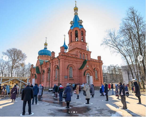 На кадрах видно, что прихожане стоят перед церковью строго в нарисованных белой краской на асфальте кружках. Судя по всему, между фигурами соблюдено расстояние не менее чем в 1,5 метра в целях предотвращения распространения коронавируса.